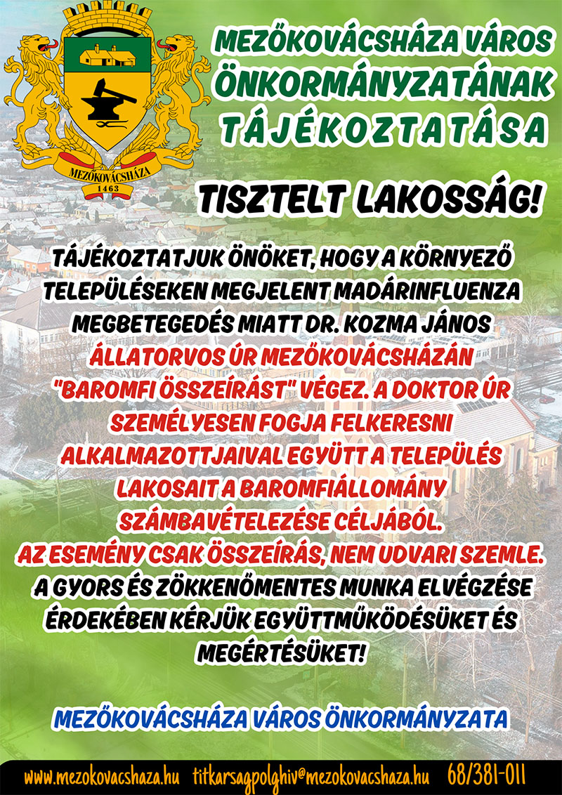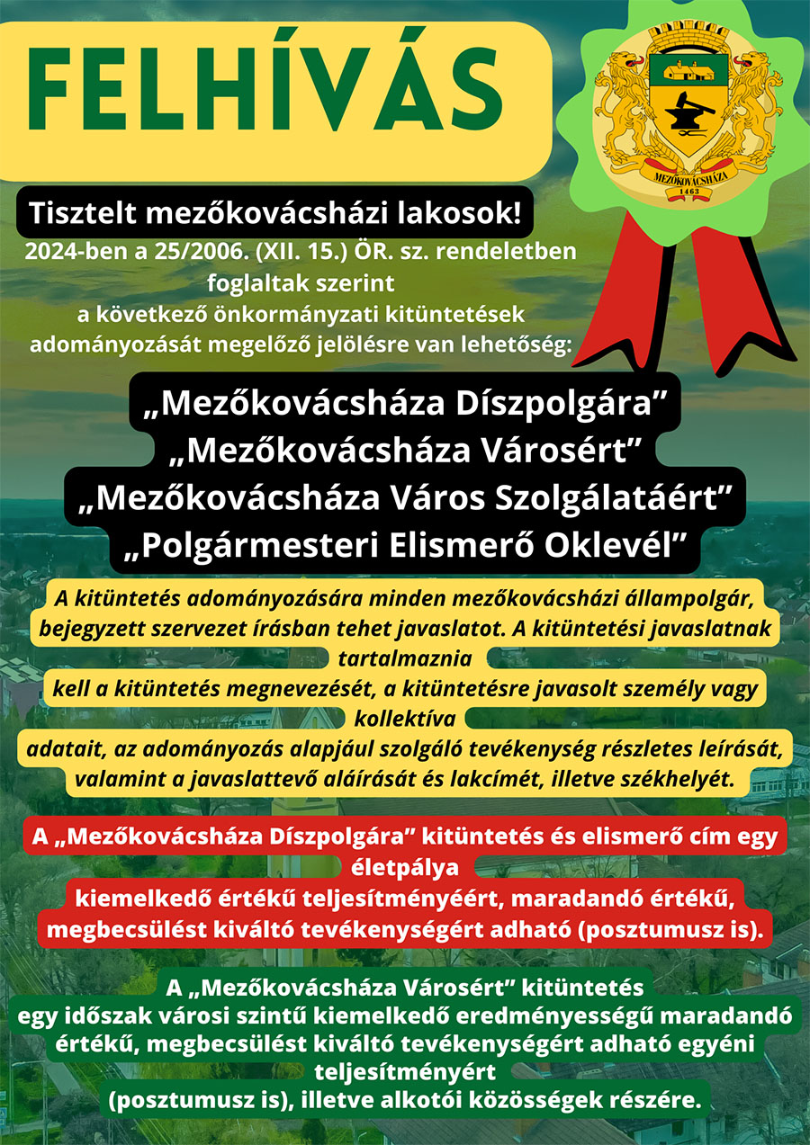 Mezőkovácsháza Város Önkormányzatának Képviselő-testülete 2024. március 27-én (szerdán) 13 órai kezdettel soros, nyílt ülést tart, melyre ezúton meghívom.