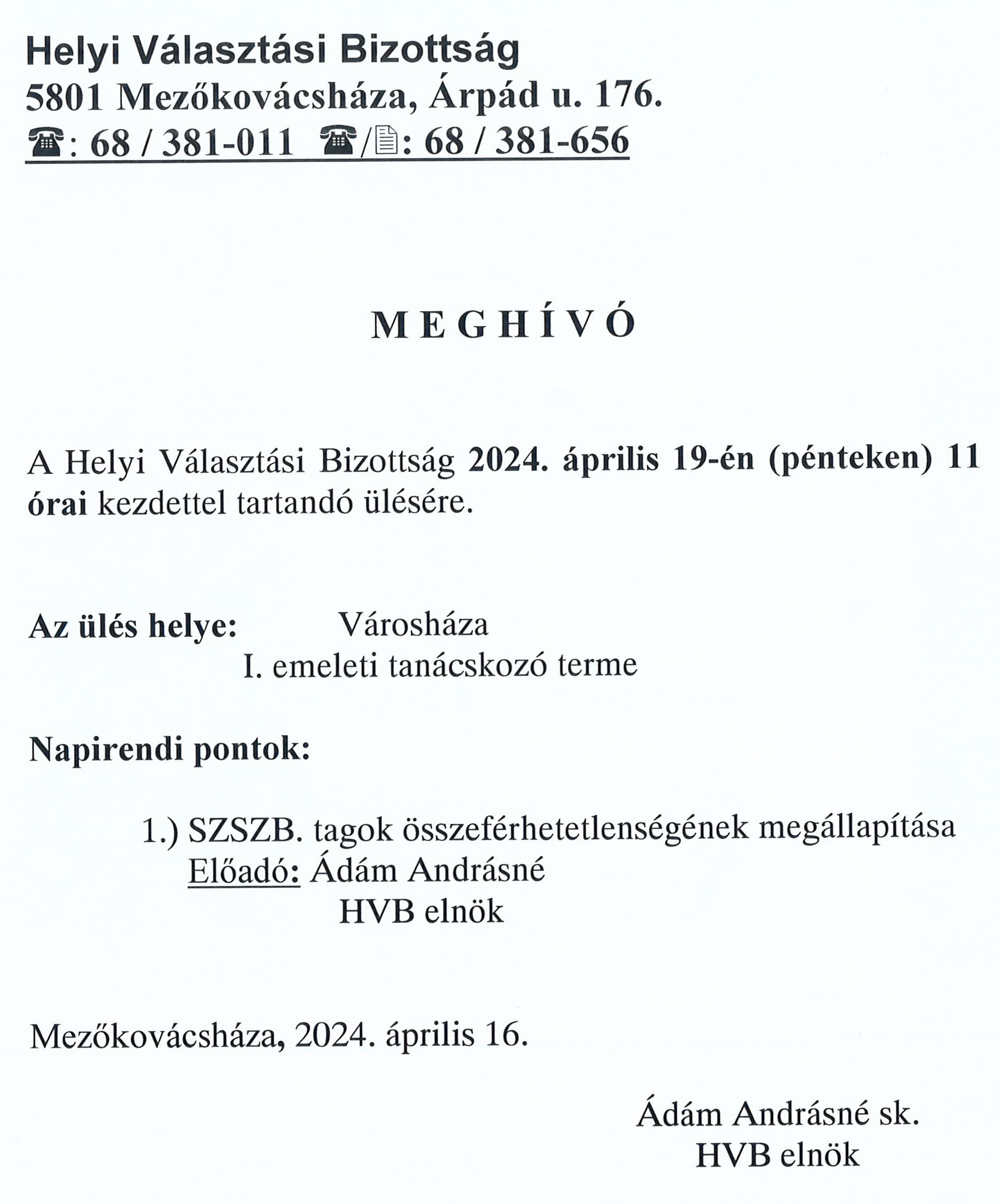 A Helyi Választási Bizottság 2024. április 22-én (hétfőn) 15 órai kezdettel tartandó ülésére.