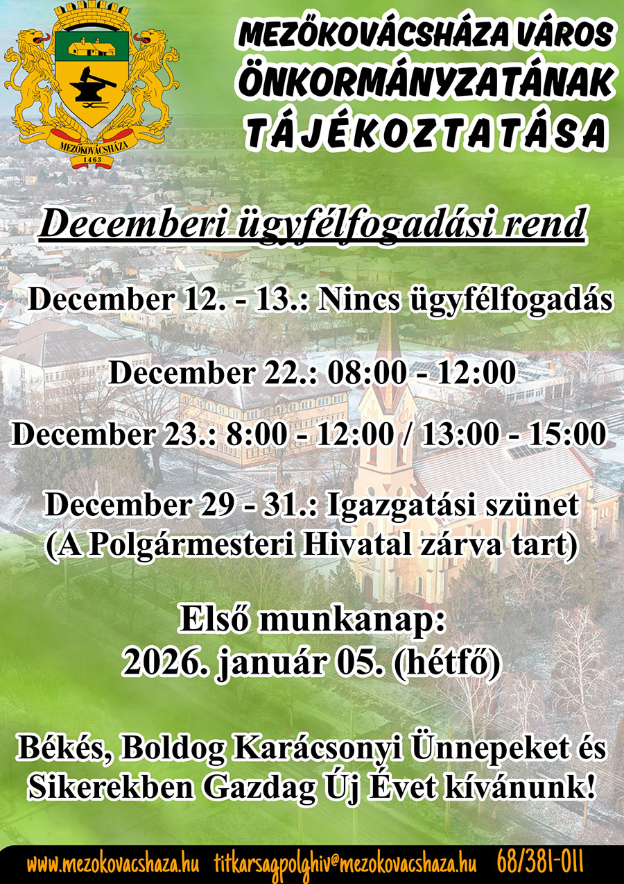 Mezőkovácsháza Város Önkormányzatának Képviselő-testülete 2025. december 18-án (csütörtök) 13:00 órai kezdettel soros, nyílt ülést tart, melyre ezúton meghívom.