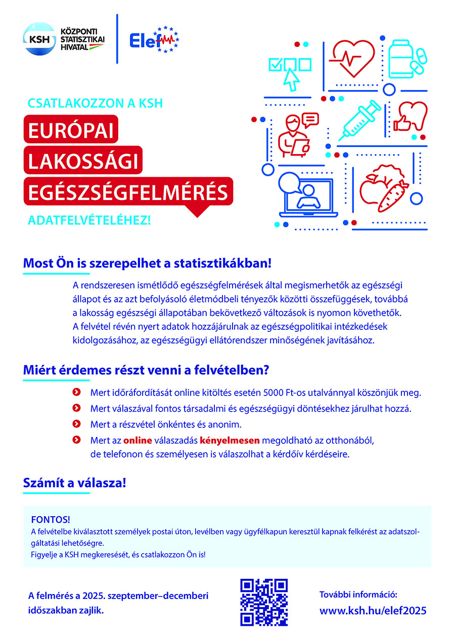 A Központi Statisztikai Hivatal 2025. szeptember és december között adatfelvételt végez az Európai Lakossági Egészségfelmérés (ELEF) keretében. A felmérés célja, hogy pontos képet kapjunk a magyar lakosság egészségi állapotáról és az azt befolyásoló életmódbeli tényezőkről.